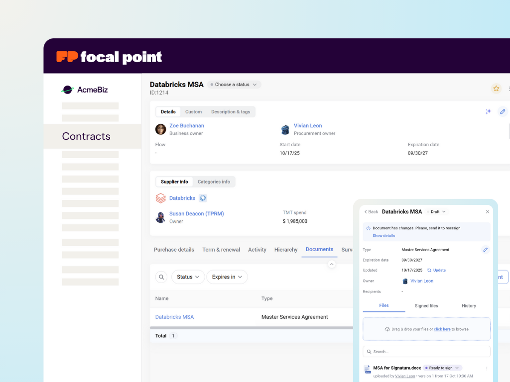 Upload, organize, and manage all contract-related documents in one place. Focal Point keeps a full version history, so you always know what changed, when, and who touched it.